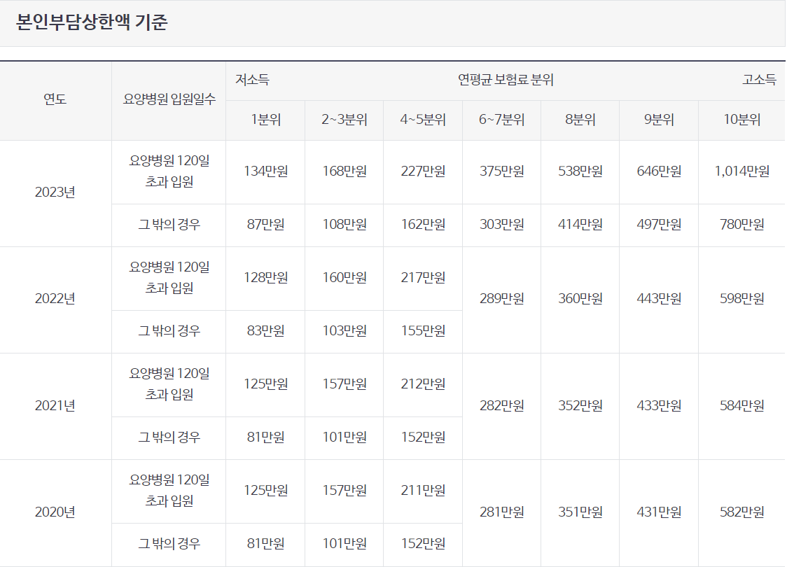 소득구간별로 본인부담 상한액이 위 표와 같습니다. 1분위가 제일 적은 소득구간이고 10분위가 제일 높은 수독구간입니다.